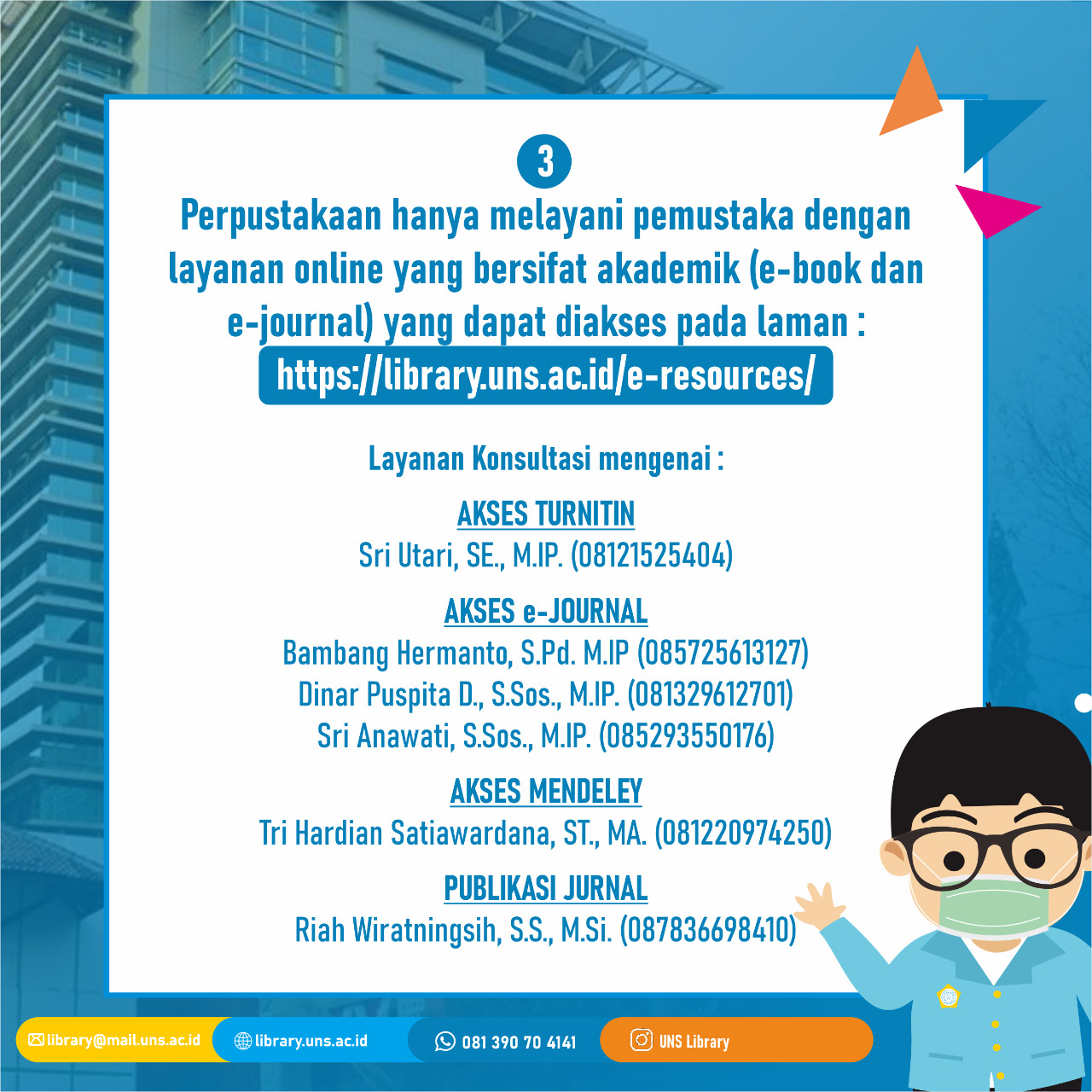 Sat perpustakaan uns merupakan sebuah sarana dan fasilitas dalam bidang ict yang khusus diperuntukkan bagi civitas akademika uns. Mahasiswa angkatan 2019, 2020, dan 2021 yang sudah memiliki kartu mahasiswa tidak perlu melakukan registrasi melalui halaman ini. Bapak/ibu, apakah perpustakaan uns melayani pengunjung umum (non mahasiswa) . Perpustakaan universitas sebelas maret (uns) menyelenggarakan kegiatan library user education 2021 tahap 3 bagi mahasiswa baru angkatan 2021. Digital library universitas sebelas maret surakarta.